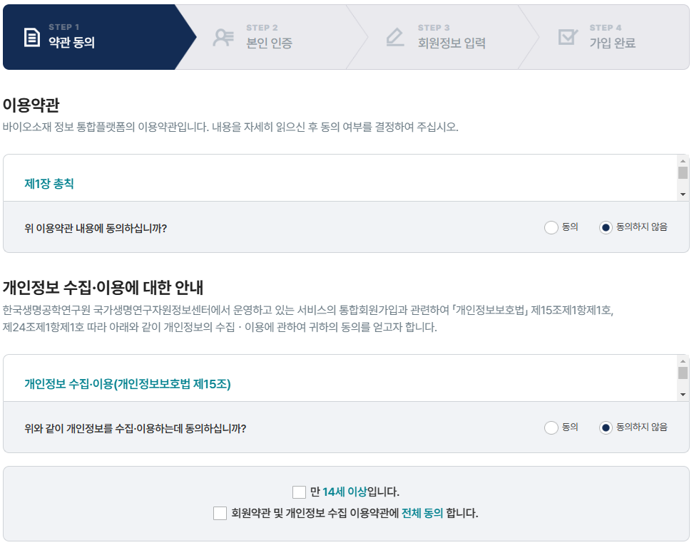 회원가입 STEP1 > 회원가입 약관 동의 절차 화면