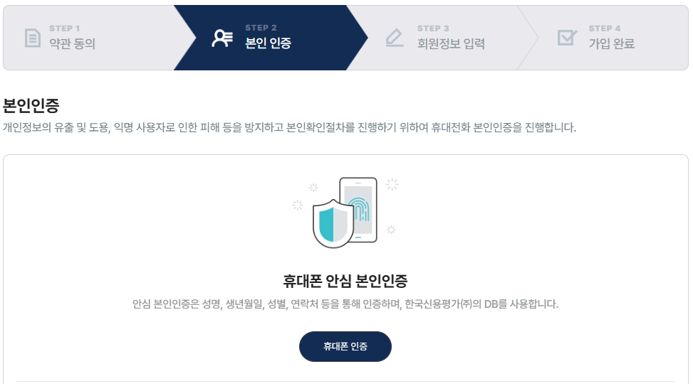 회원가입 STEP2> 휴대폰 본인인증 팝업창 화면
