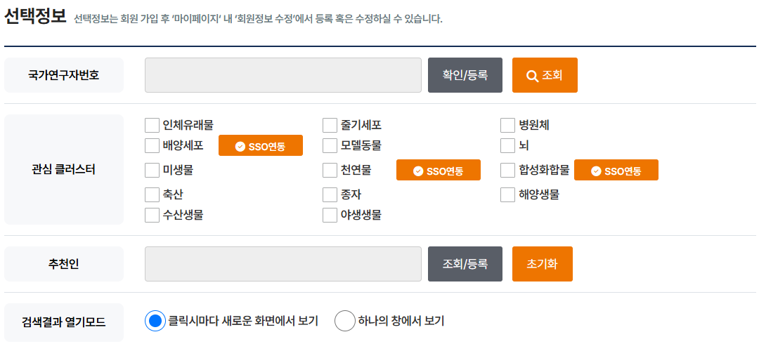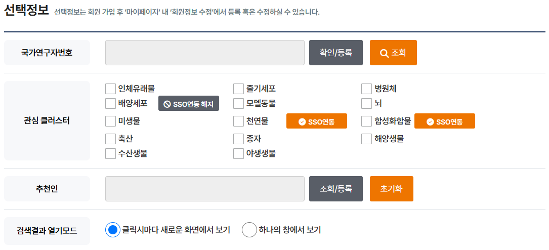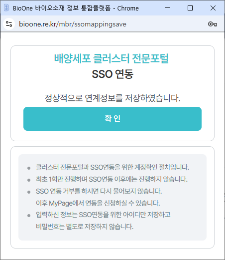 - 선택정보 > 관심 클러스터 의 배양세포 SSO연동 버튼을 클릭하면 아래와 같이 "배양세포 클러스터 전문포털 SSO 연동" 팝업창이 실행됩니다.