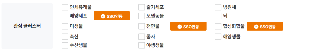 - 현재 바이오원과 SSO 연동이 가능한 곳은 배양세포, 천연물, 합성화합물 클러스터 입니다.