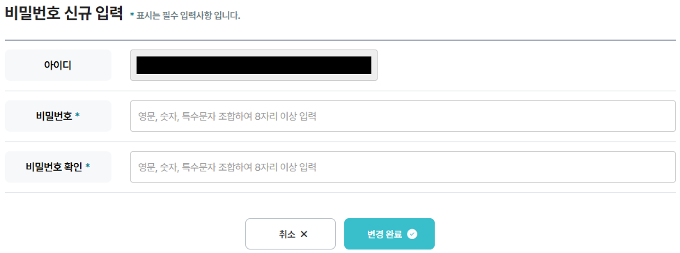 - 비밀번호는 영문,숫자,특수문자(!@#$%^&*()만 허용)를 사용하여 8자리 이상을 입력해주세요.