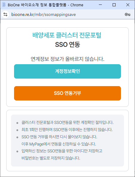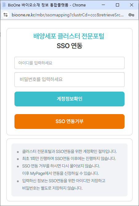 위 SSO 연동 팝업창에서 배양세포 클러스터 전문포털(중앙은행)에 가입한 계정의 아이디와 비밀번호를 입력하고 계정정보확인 버튼을 클릭합니다.